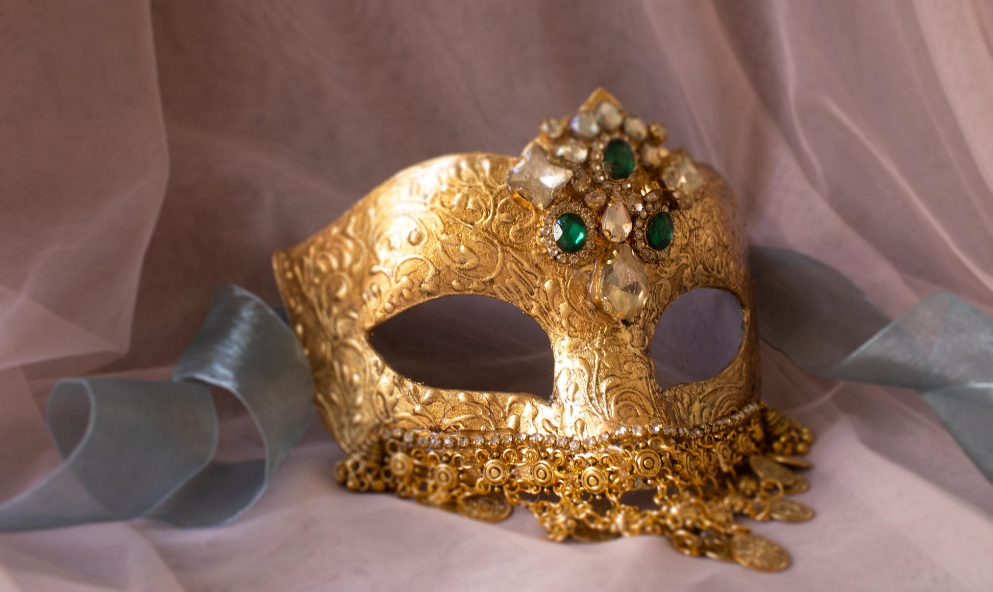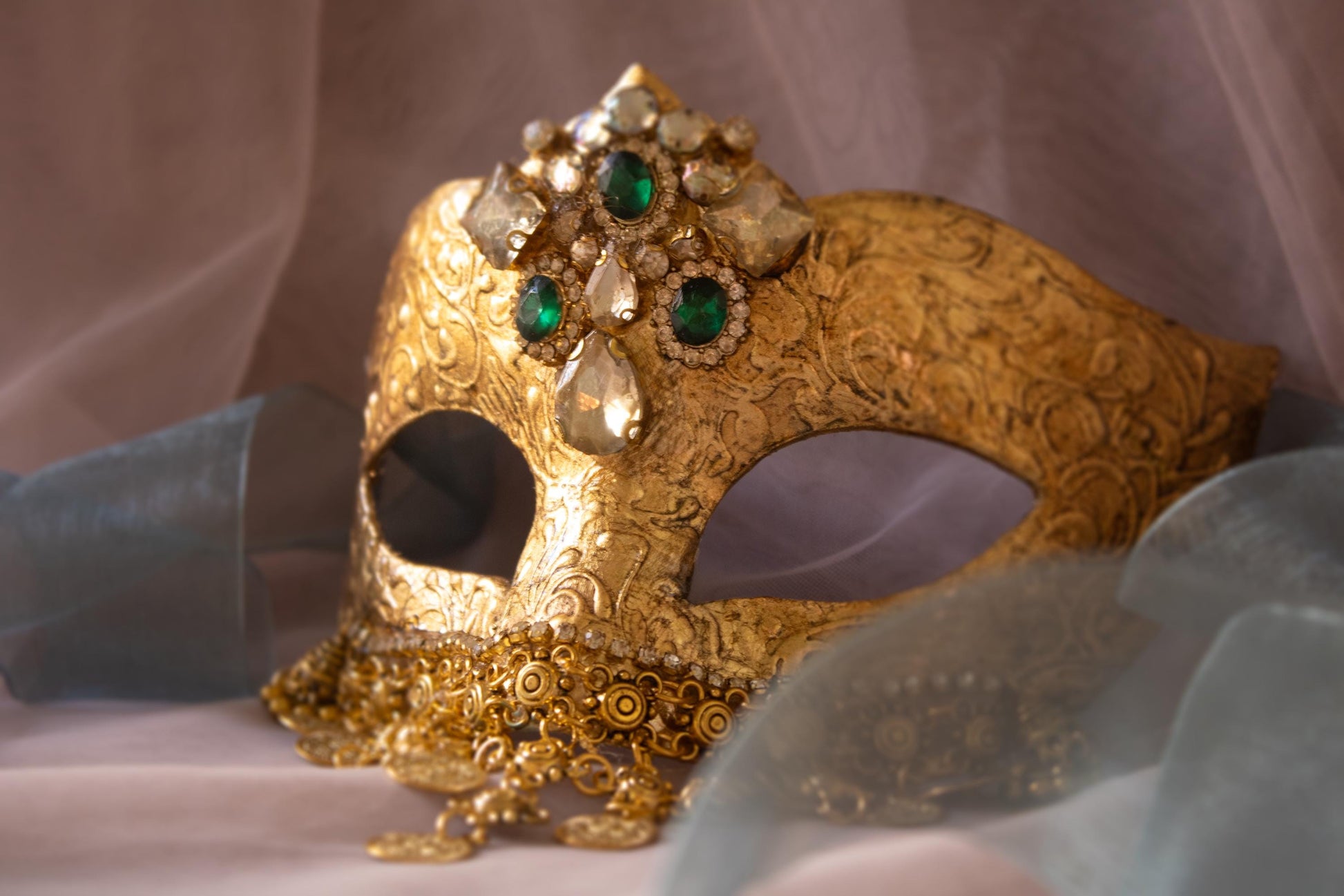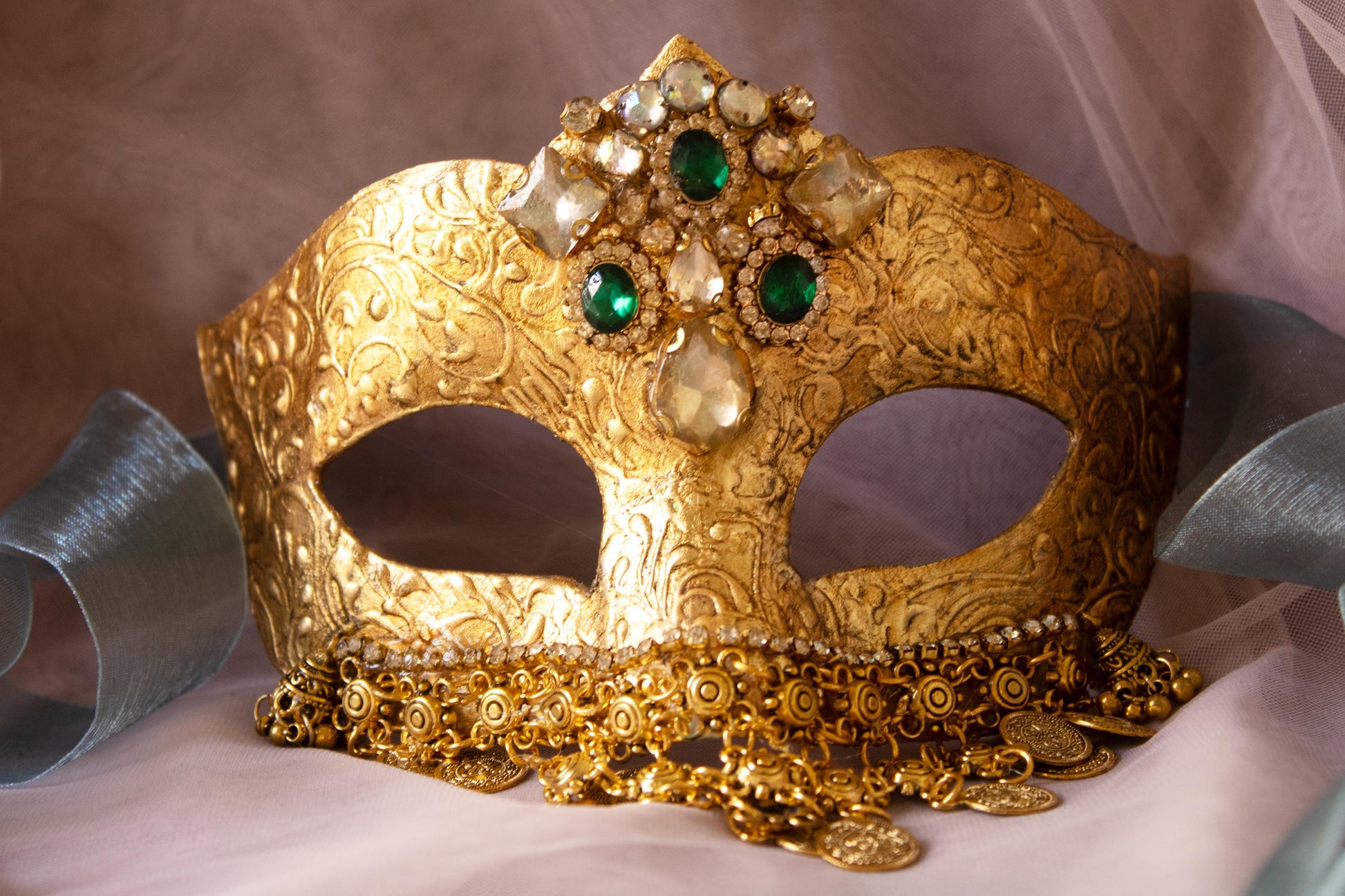 Maschera veneziana realizzata a mano con foglia d'oro e strass. Molto comoda da indossare, con una bella decorazione.